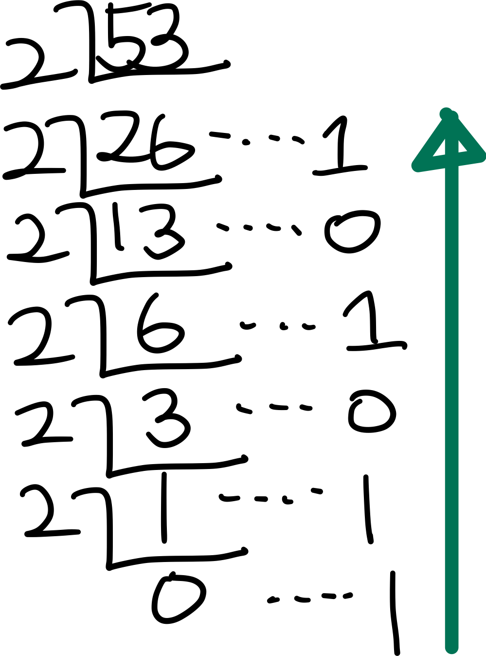 53은 실수이며 '정수'이기 때문에 몫이 0이 될 때 까지 변환하려는 기수로 나누면서 각 단계마다 나오는 나머지를 나열하는 방식으로 구할 수 있습니다.